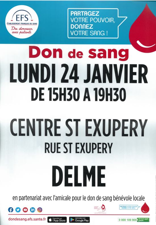 Collecte de sang Lundi 24 Janvier 2022 de 15h30 à 19h30 Salle Saint Exupéry à DELME.